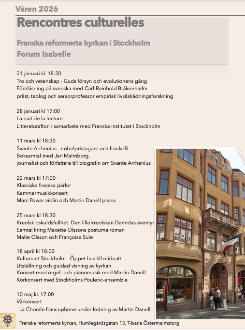 Välkommen att fira julgudstjänst i den Franska Reformerta kyrkan i Stockholm söndagen den 21 december 2025 som leds av vår gäst pastor Jean-Luc Blanc, ordförande för (CEPF) Communauté des Eglises Protestantes Francophones och vår pastor Elie Kabwe med körsång av "Franska Kören".